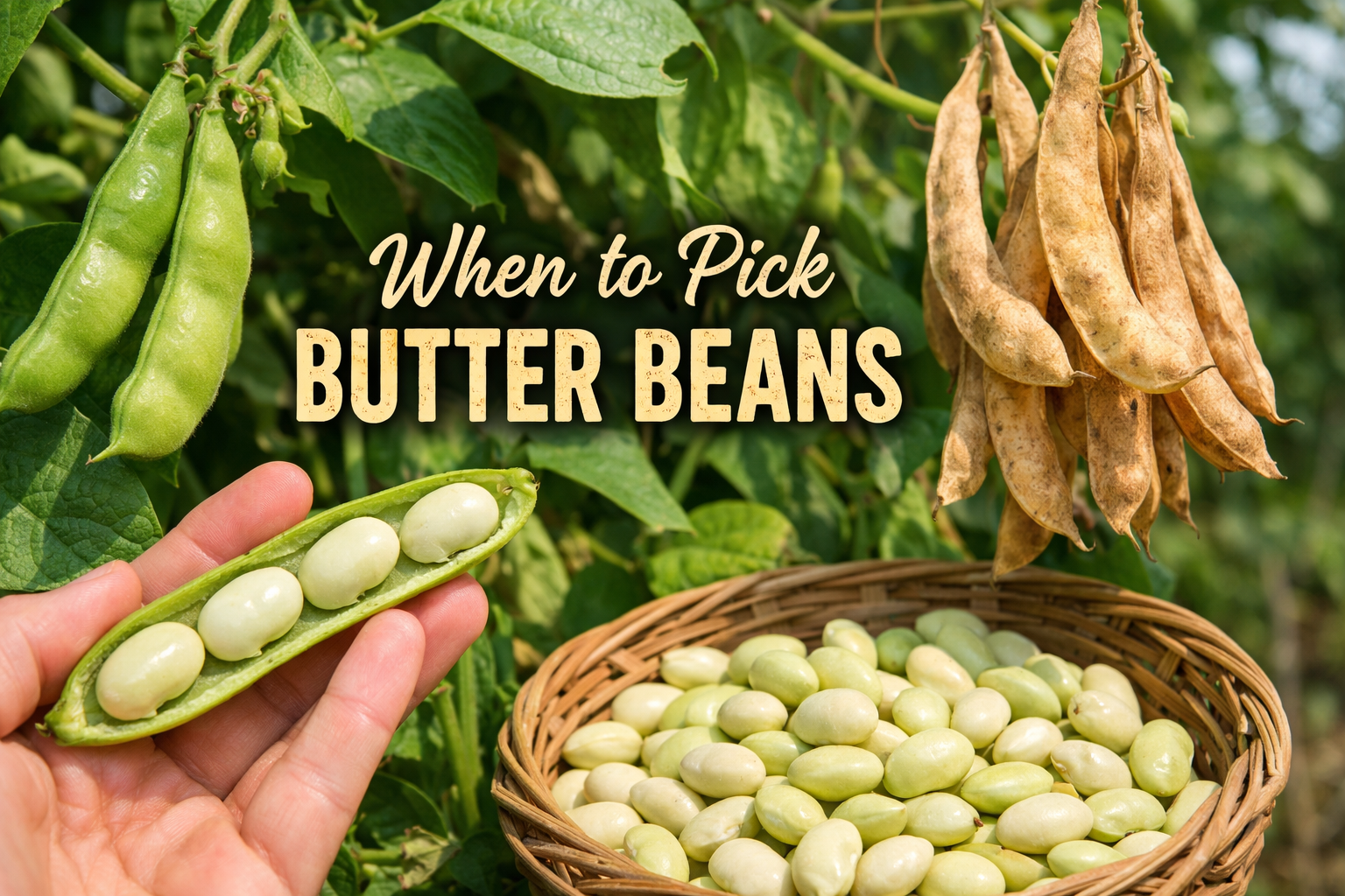 If you’re wondering when to pick butter beans, the clean answer is this: pick for fresh shelling when the pods feel well filled and the beans inside are full size but still soft. Leave them longer for dry beans until the pods turn tan or brown, dry down, and go brittle. In University of Maryland Extension’s harvest guide for lima beans, the fresh-shell stage is described as full-size seeds inside bright green pods, which is a much better cue than the vague old advice to harvest “when they look plump.”